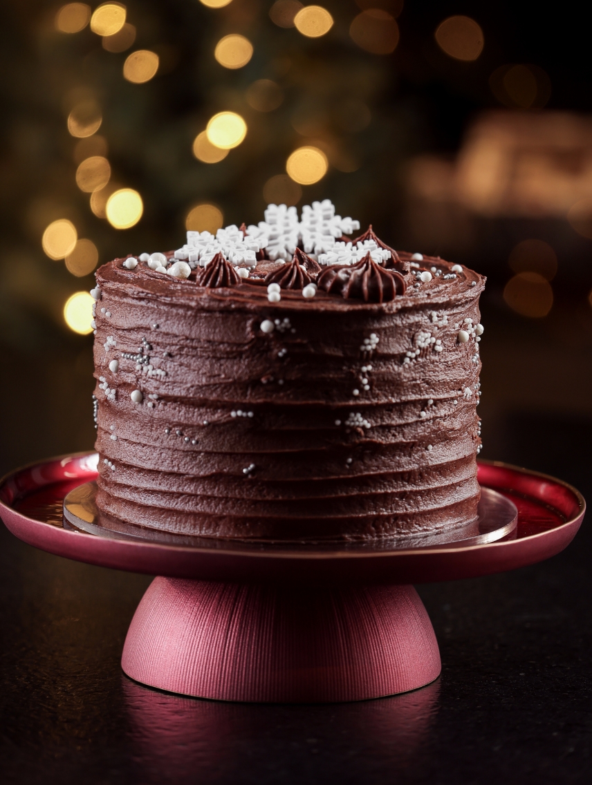 Nuestra versión reconfortante de Choco mazapán. Suave pan de chocolate ahora con betún clásico de mantequilla, relleno de caramelo casero, cacahuate y mazapán. Acompáñalo con una taza de chocolate caliente con bombones. Incluyen cake toppers de copos de nieve.