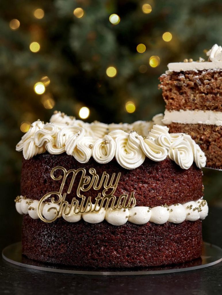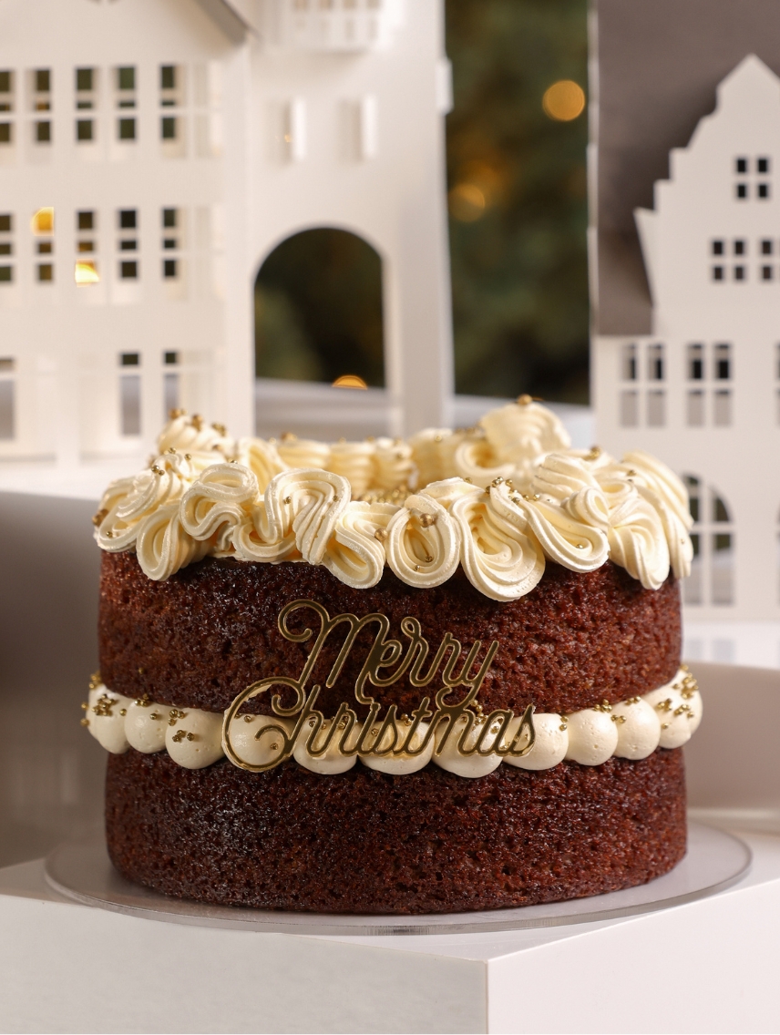 Pan delicado de vainilla, con relleno de coco y almendra caramelizada, cubierto con merengue suizo y decorado con galletas de jengibre. El toque perfecto para esa noche especial de Navidad en familia o con amigos.